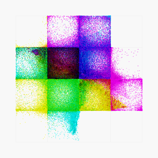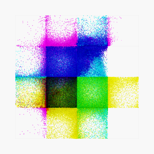 This work is an attempt to create arbitrary colors and shapes from three triangles that emit particles (of cyan, magenta and yellow colors). During their short lives, these particles will be pushed to the sides of the grid cells.
