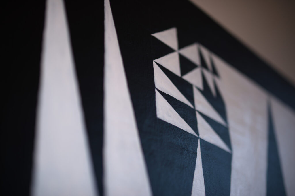 La composition est créée sur la base d’une grille, ou de manière aléatoire chaque case peut être divisée en deux, et ce de manière répétée (recursion). La suite du protocole est assez simple puisqu’elle consiste à placer des triangles dans chacune des cases. À travers cette simplicité, cette radicalité, on peut percevoir les influences du mouvement Op Art, du groupe GRAV ou du travail de Lia Drei.